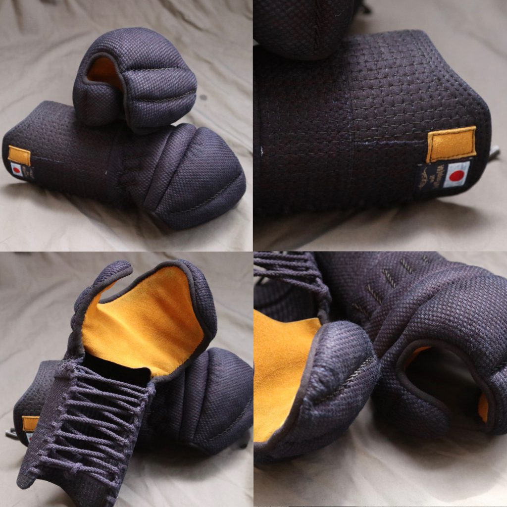 ・日本製面金、埼玉武州藍染木綿/織刺(共通)、真綿 軽量純フェルト(面・垂)、木綿手作り内輪(面)、日本製TORAYウルトラスウェード(手の内)、日本製鹿毛(小手) 50本樹脂胴台(少年用は樹脂ヒラ胴台)等等