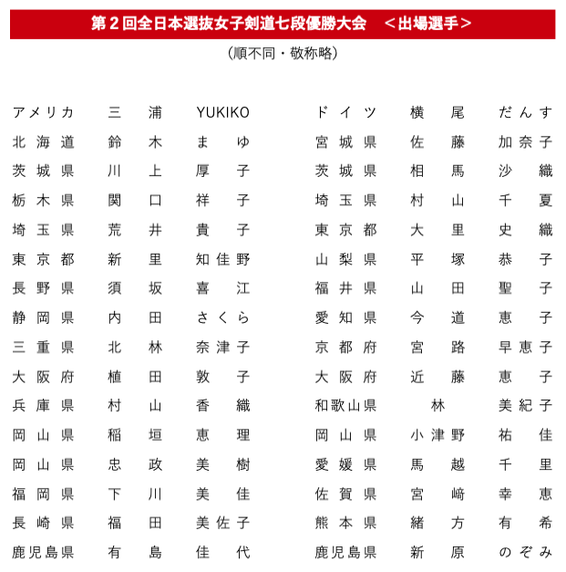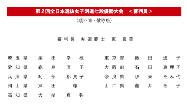 第2回全日本選抜女子剣道七段優勝大会が2025年12月14日(日)、山梨県甲府市・小瀬スポーツ公園 武道館にて開催される。出場選手は「選手選考委員会」において選考された剣道七段受有者女子32名、海外からも2選手が参加しトーナメントで優勝を目指す。前回大会ベスト4、緒方(熊本)、下川(福岡)、近藤(大阪)、大里(東京)も出場予定となっており、前回は負傷欠場した新里(東京)もエントリーし、優勝は争いさらに注目となる。LET’S KENDOでは速報予定!