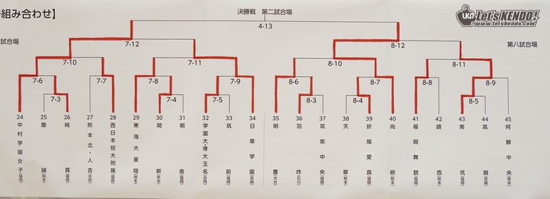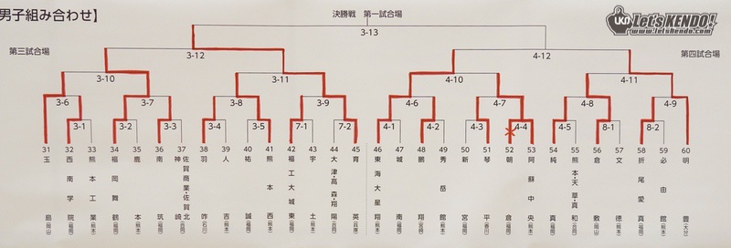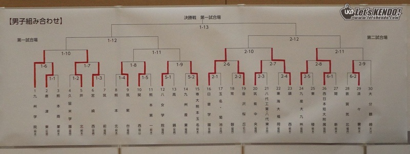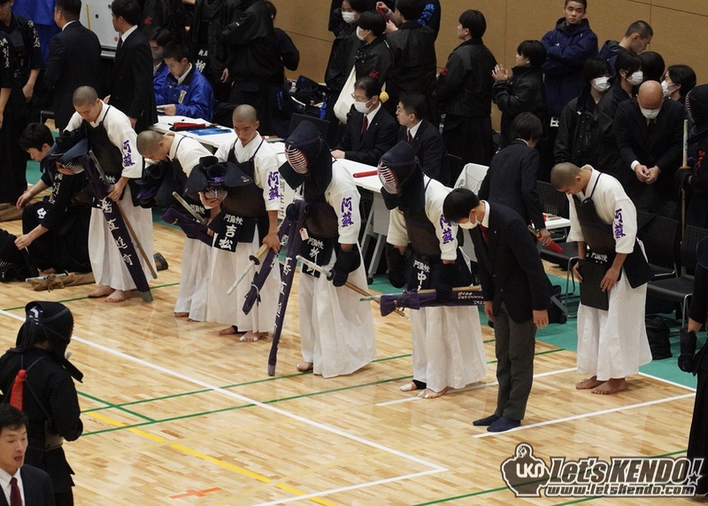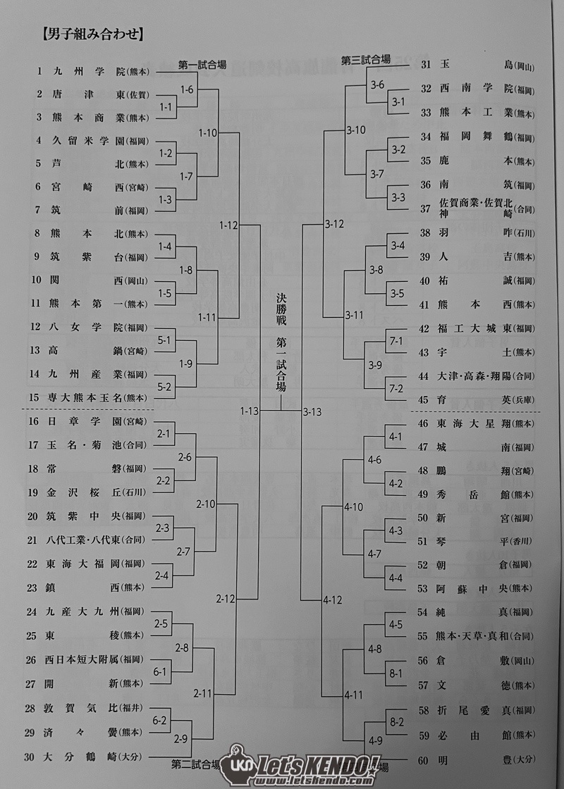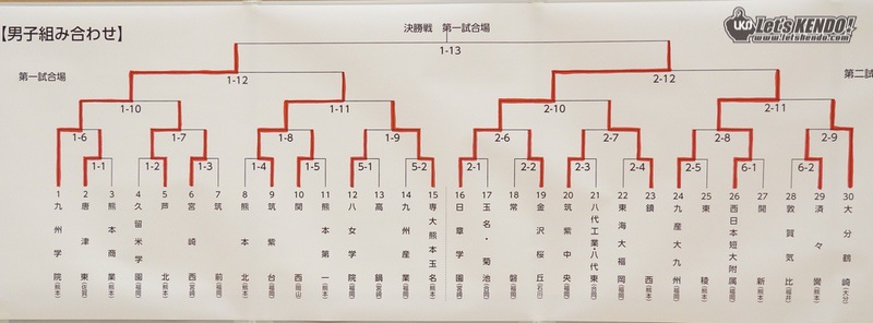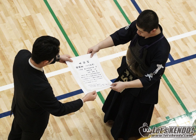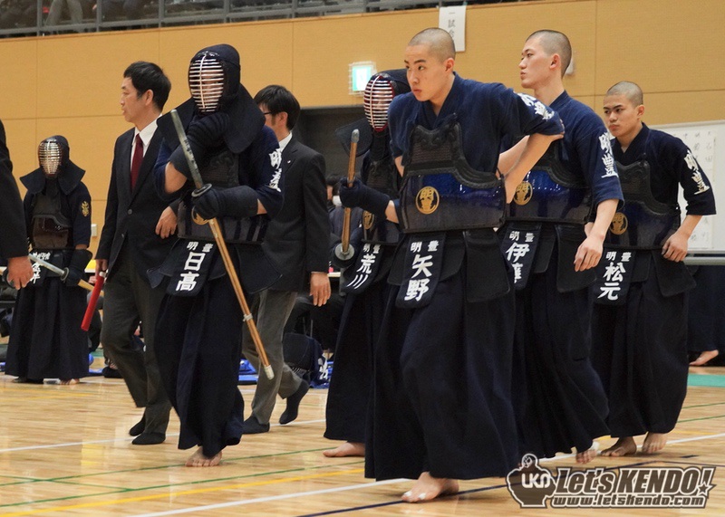 決勝戦は前回大会同カード、九州学院と明豊の対戦に。明豊は準々決勝で東海大星翔、準決勝の育英とも大将戦の接戦に勝利して決勝へ勝ち進んだ。決勝戦でも九学の勢いは衰えず、先鋒・金井が4人を斬り抜くも明豊大将・矢野に敗れたが、九学次鋒・落合が鋭いコテを決めて優勝を果たした。