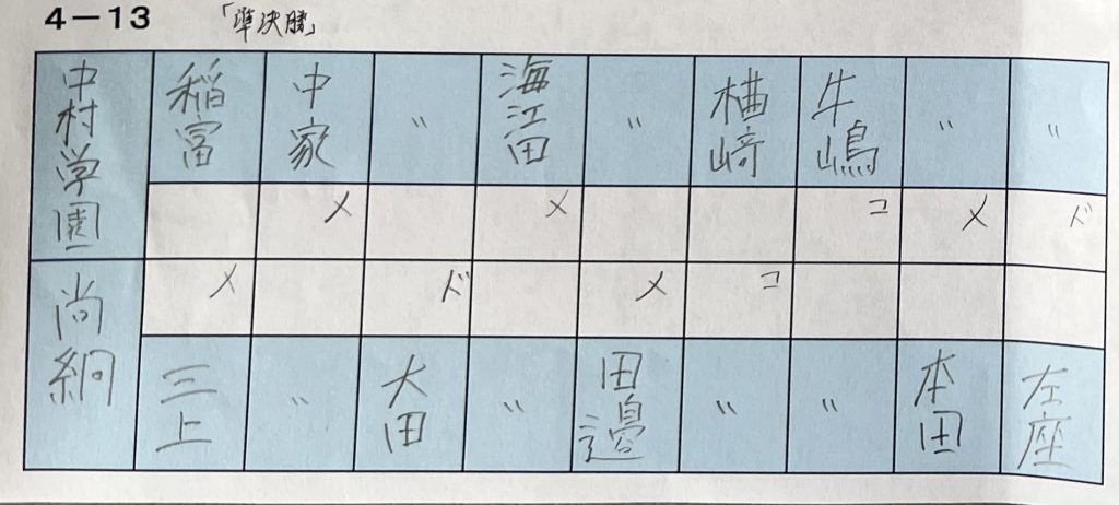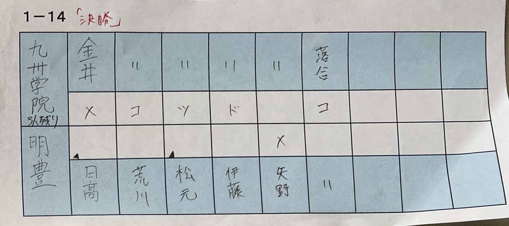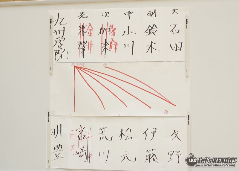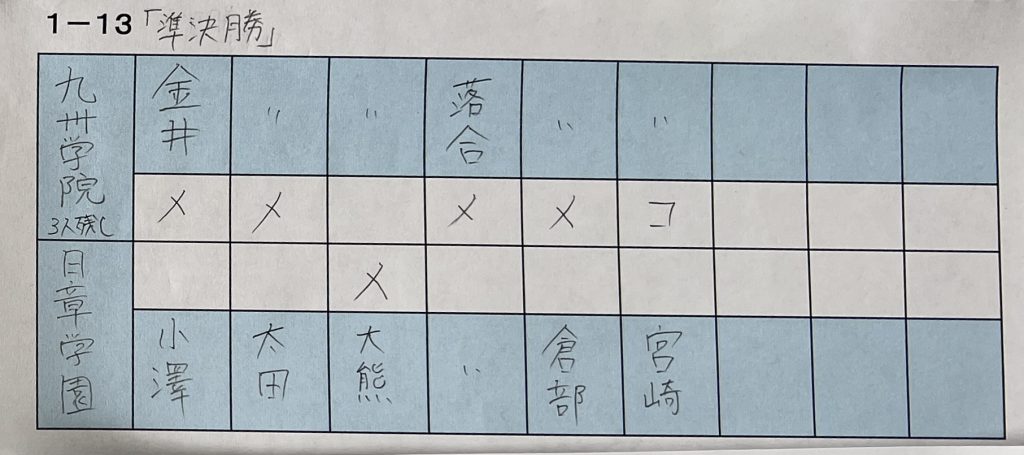 前回大会優勝の九州学院は先鋒、次鋒選手を選手交代しつつ勝ち抜き、準々決勝では筑紫台、そして準決勝の日章学園戦でも九学は先鋒・金井、次鋒・落合で勝利した。日章学園は序盤戦で伊東が15人抜きなど後ろ三人の出番なく勝利していたが、準決勝では九学の勢いに飲み込まれてしまった。