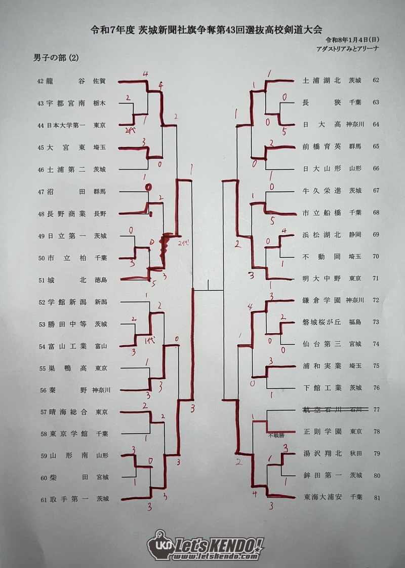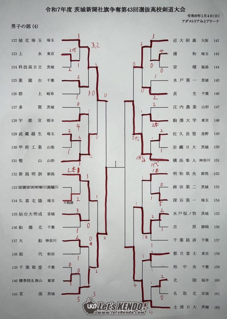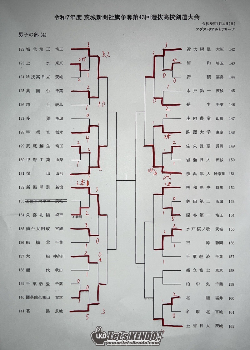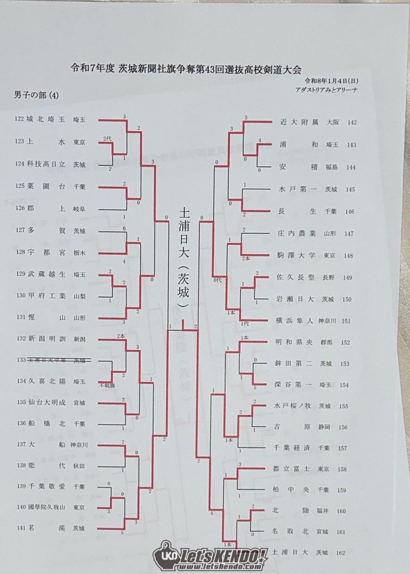 1/4(日)の男子の部(162チーム)は、ベスト4に茨城勢3チームが勝ち上がり、取手第一が大会連覇中の水戸葵陵から代表戦で勝利し決勝進出。静岡の浜名が準決勝まで勝ち上がったが前回大会二位・土浦日大に敗れた。決勝戦、初優勝を目指したが取手第一だったが、土浦日大・多田が大将戦で勝利し2-1で優勝を決めた。土浦日大は第24回大会以来、久々の優勝となった。