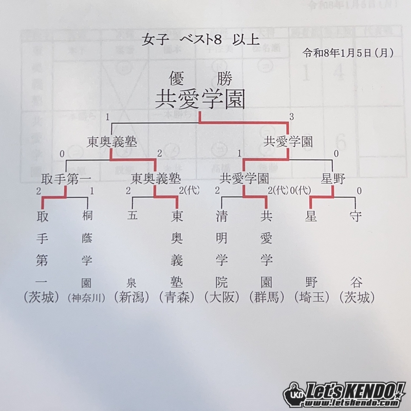 1/5(月)は女子の部(131チーム)は共愛学園が初優勝、二位は東奥義塾となった。 共愛学園は準々決勝で大阪・清明学院との代表戦を制し、準決勝では前回優勝の守谷に1-0の接戦と、強豪校に勝利し優勝した。