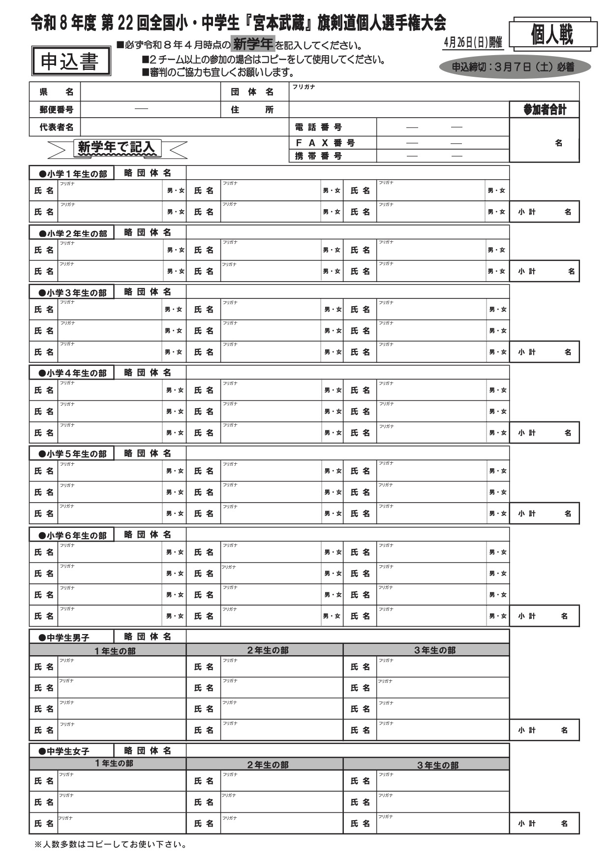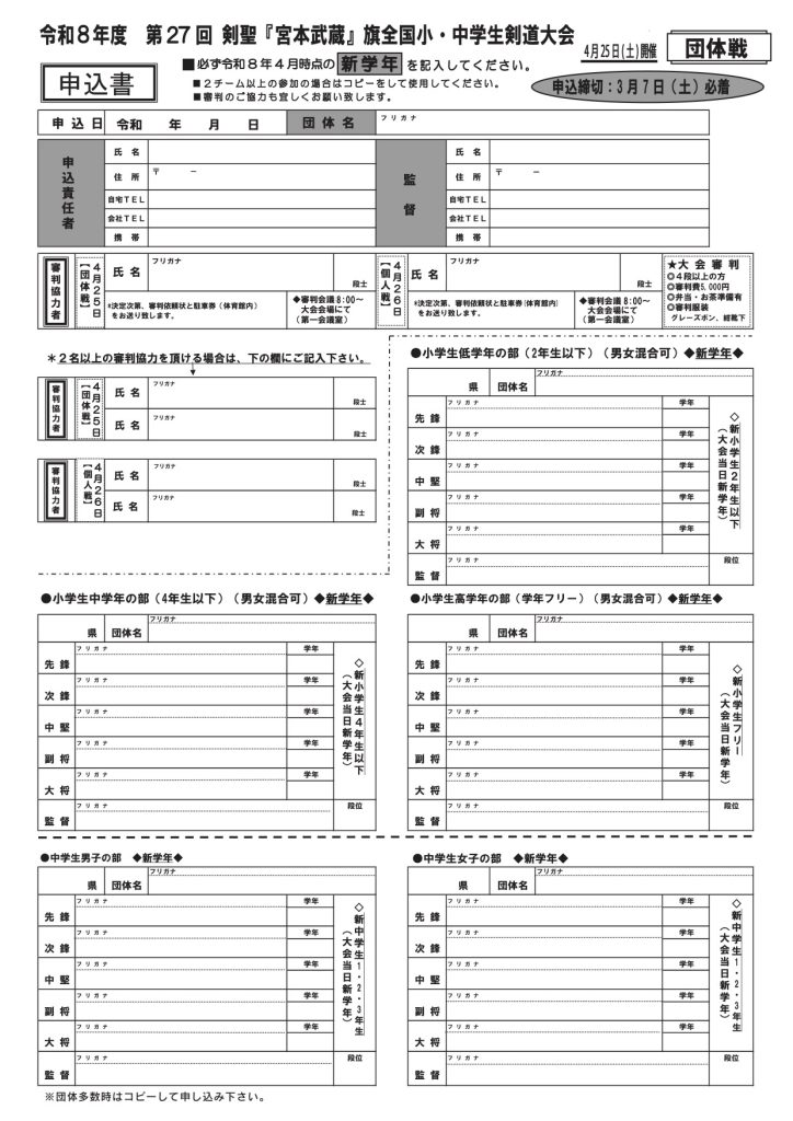 ※少年剣道の春の祭典、剣聖「宮本武蔵」旗 全国小・中学生剣道大会の大会出場エントリーを受付中!(3/7(土)までに事務局へ)