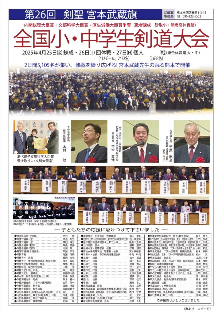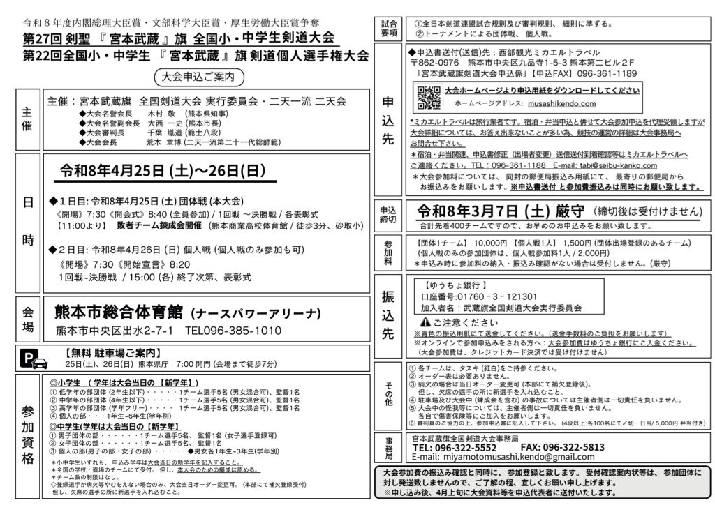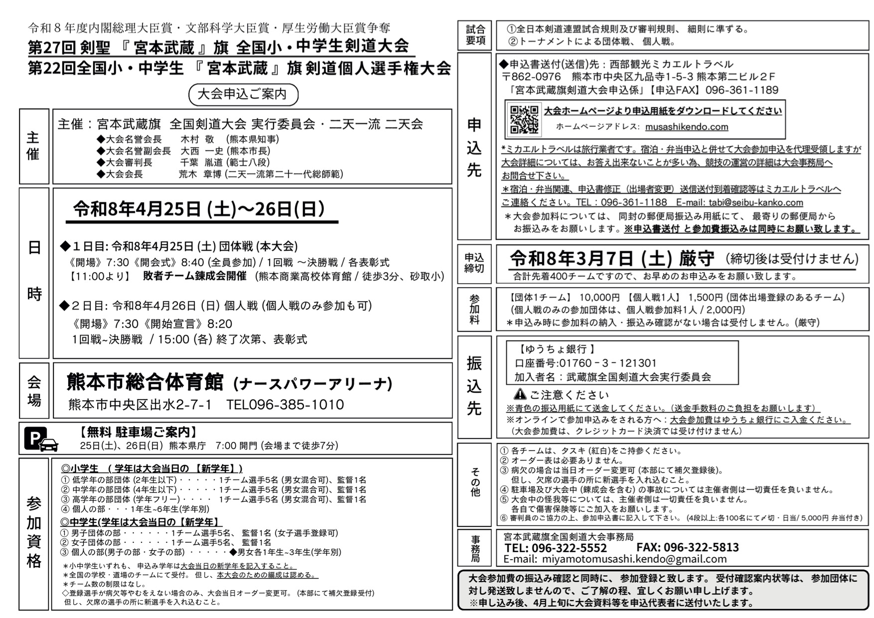 第27回剣聖「宮本武蔵」旗 全国小・中学生剣道大会が2026年4月25日(土)〜26日(日)、熊本県総合体育館(ナースパワーアリーナ)にて開催される。