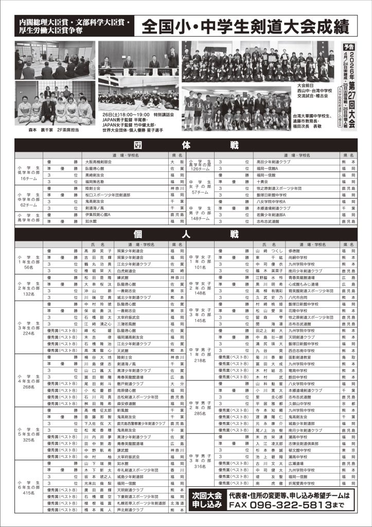 前回大会の団体戦の優勝は、中学男子が八女学院(福岡)、中学女子が福岡一信館(福岡)、小学生高学年は伊集院剣心館A(鹿児島)と九州勢が、小学生中学年は睦剣志会(神奈川)、低学年では大阪高楠剣朋会(大阪)と関東、関西勢も活躍を見せた。