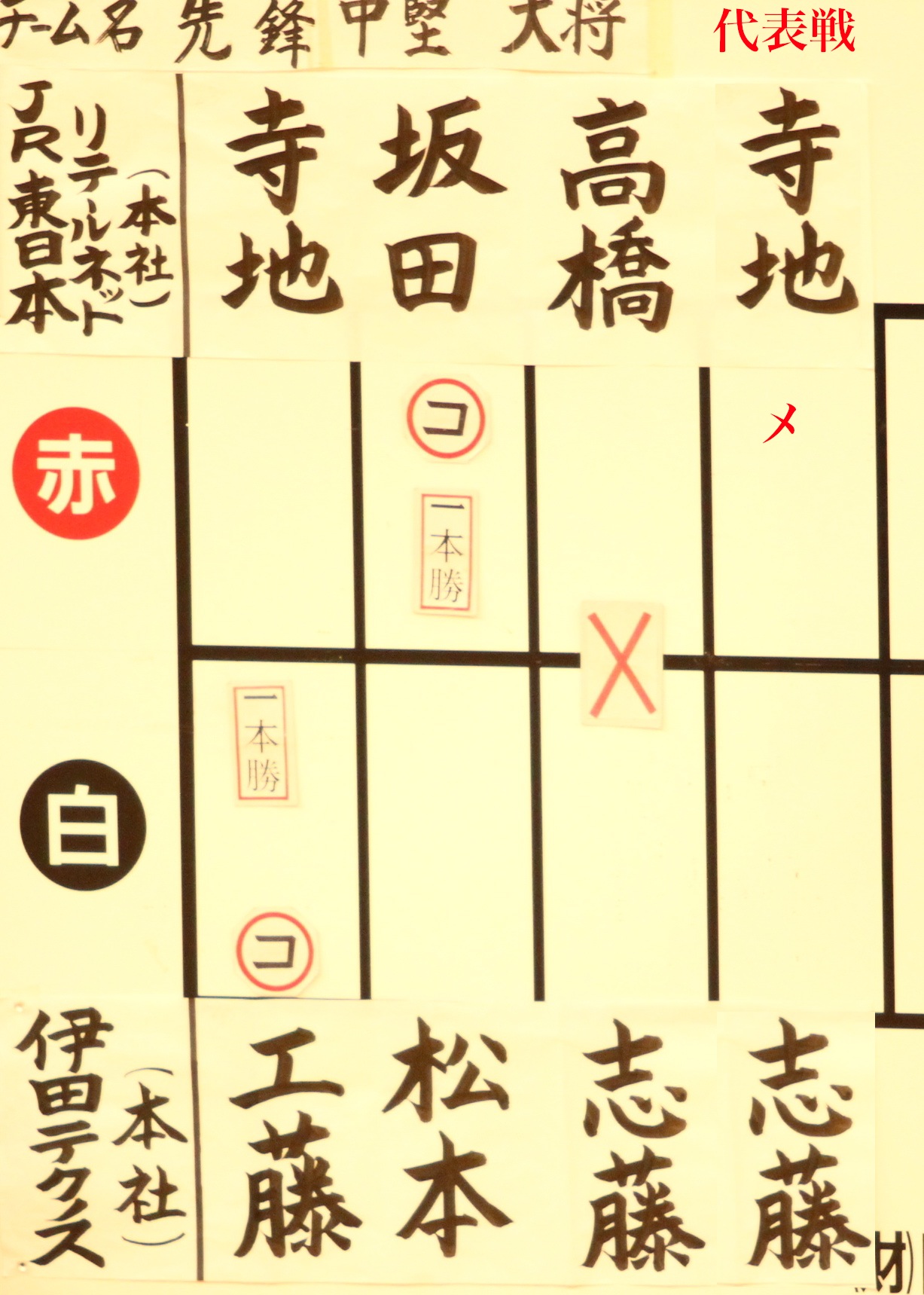 中堅戦、試合巧者のJRリテール・坂田は伊田テク・松本の攻めを封じるかのごく出ばなや引き技を繰り出す。試合終盤に坂田が松本の浮いた手元を見逃さずをコテを奪い一本勝ちし、勝負を大将戦へとつないだ。
