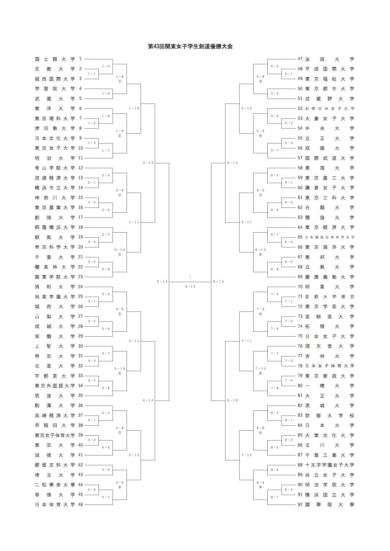 第43回関東女子学生剣道優勝大会 2017/9/16(土) 東京足立区・東京武道館 試合:5人生団体戦、4分3本勝負 ※全日本女子学生剣道優勝大会(11/12:春日井)出場権 18校 ・ベスト16進出校、出場決定戦2校 ※大会詳細・組合せなどは【関東学生剣道連盟HP】に掲載されております。
