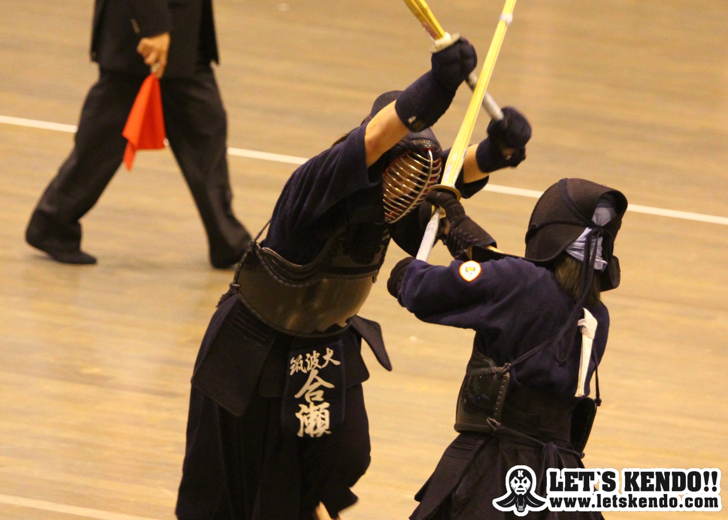 先鋒戦、筑波・合瀬は厳しいから一瞬居着いた中大・浅野へメンに飛び込み一本勝ち。浅野も引き面など良い攻めを見せた。